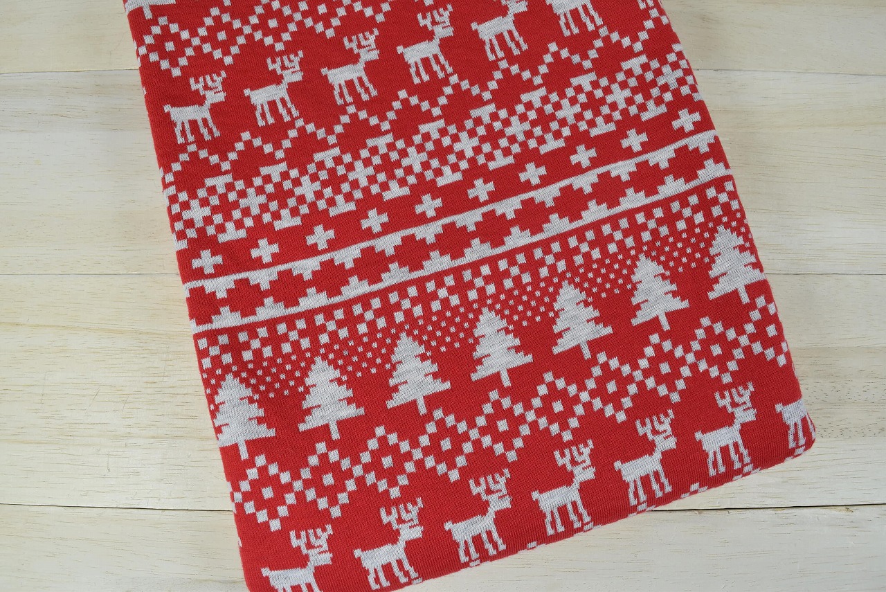 リバーシブルジャガードニット生地 ウインターホリデー柄                色:アッシュ杢/レッド