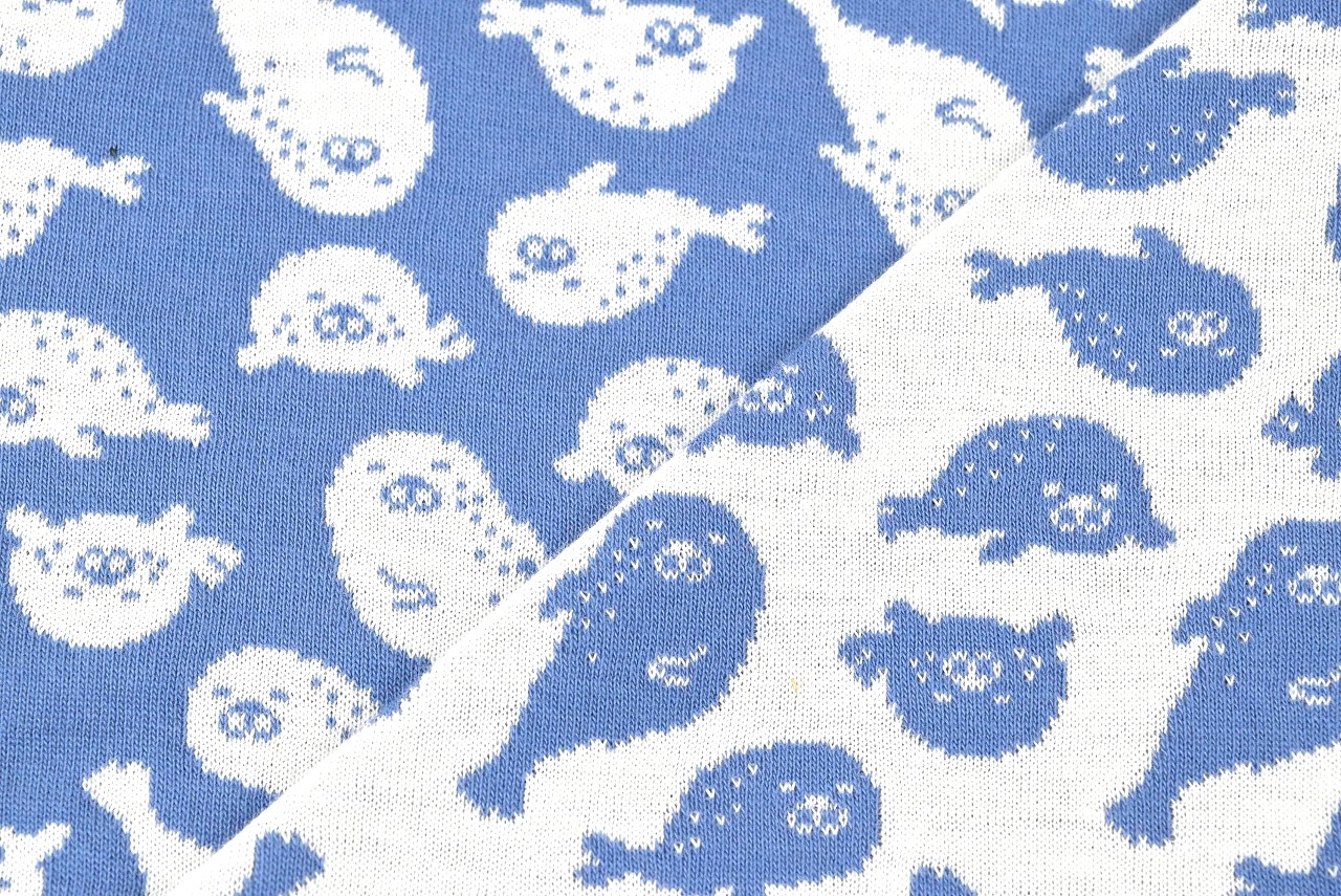 リバーシブルジャガードニット生地 ぷかぷかごまちゃん柄               色:デニム/アイボリー