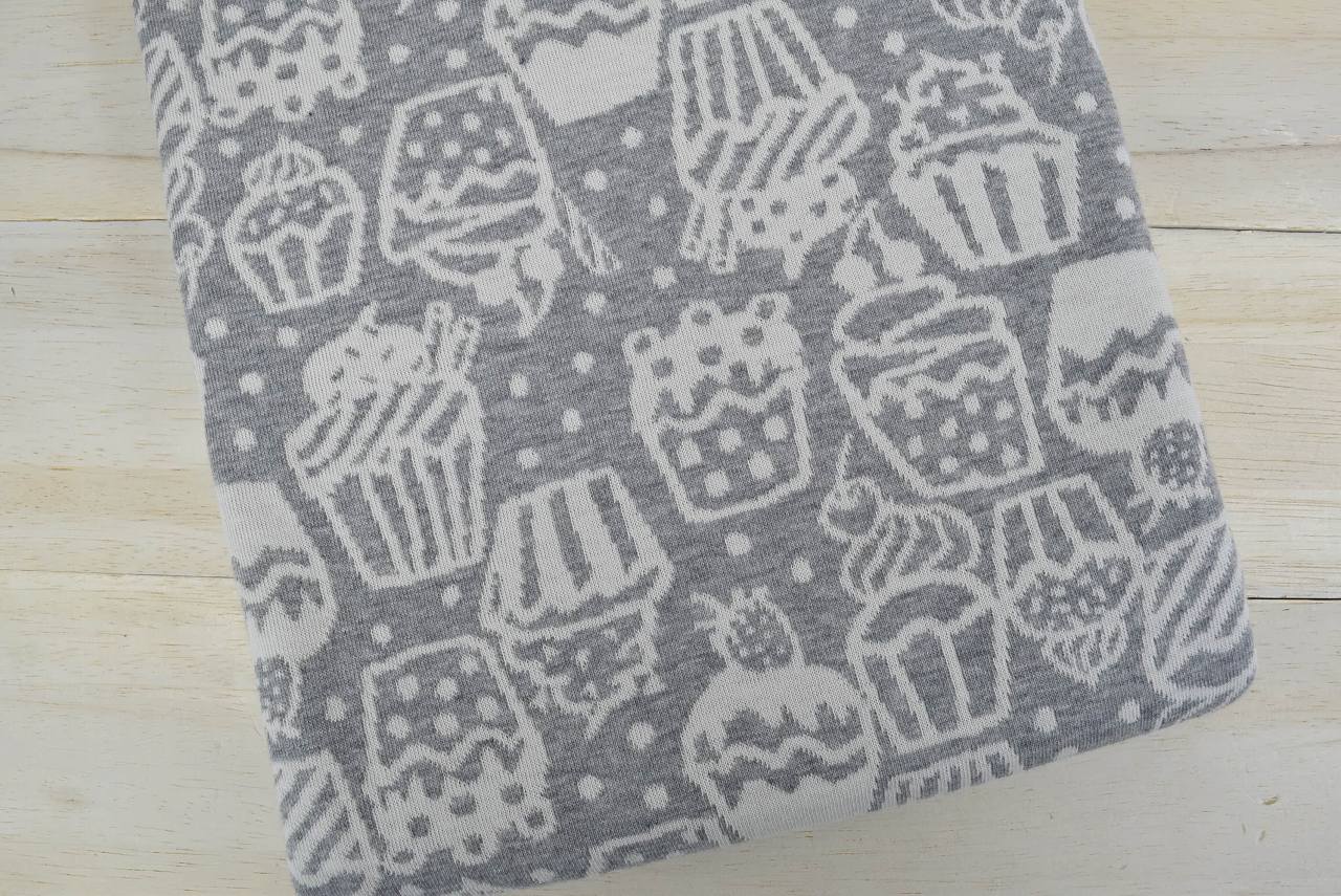 リバーシブルジャガードニット生地 カップケーキ柄           色:杢グレー/アイボリー