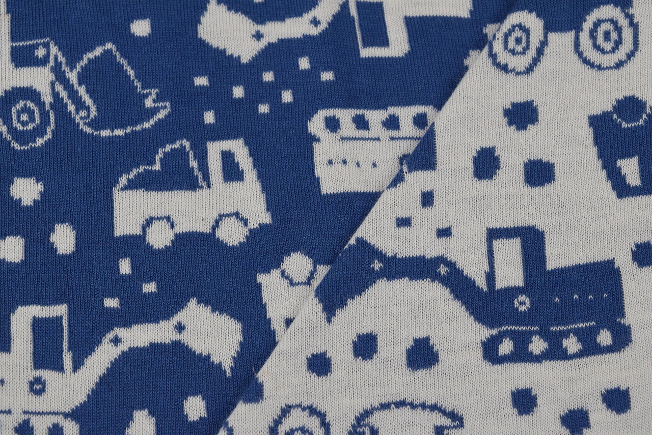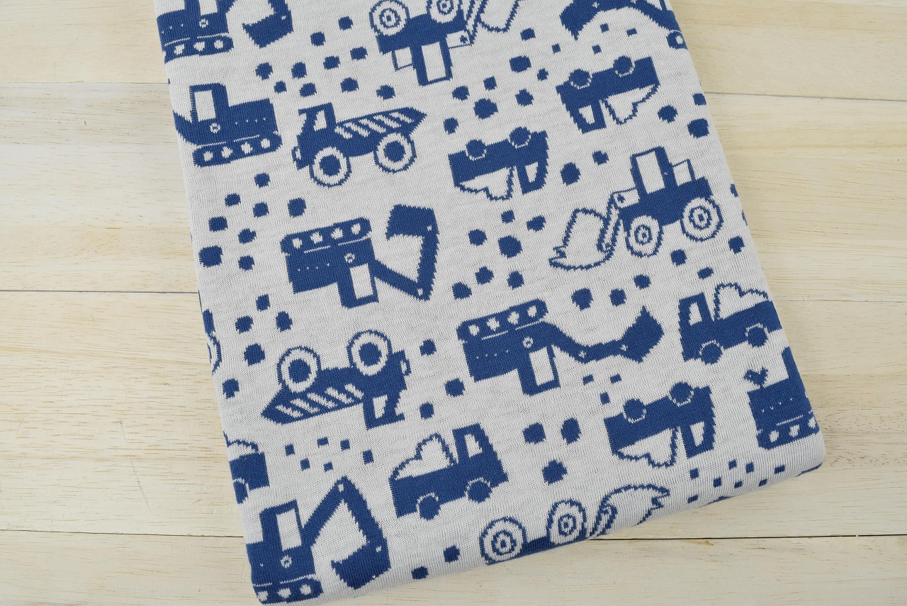 リバーシブルジャガードニット生地 ショベルカー柄               色:ジェイブルー/アイボリー