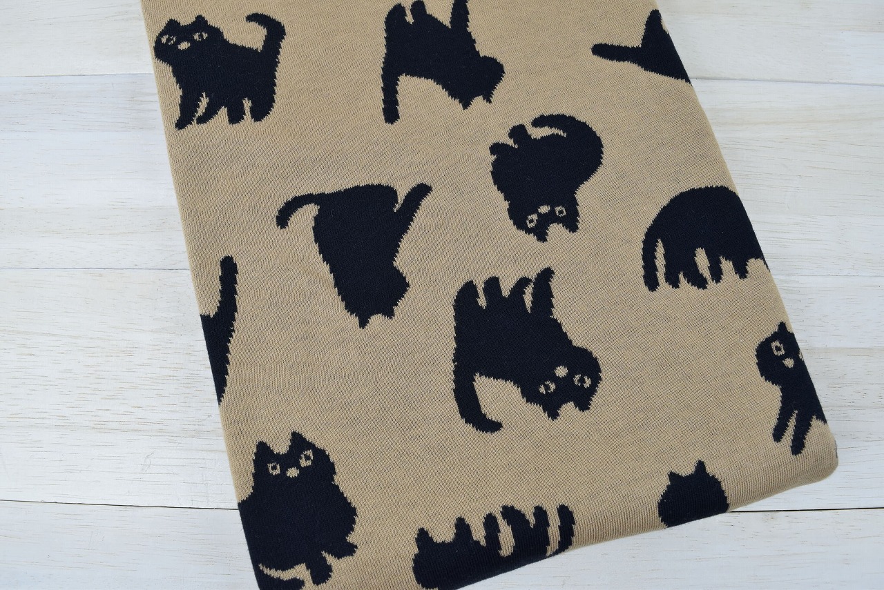 リバーシブルジャガードニット生地 チャビーキャット柄              色:黒/くるみ