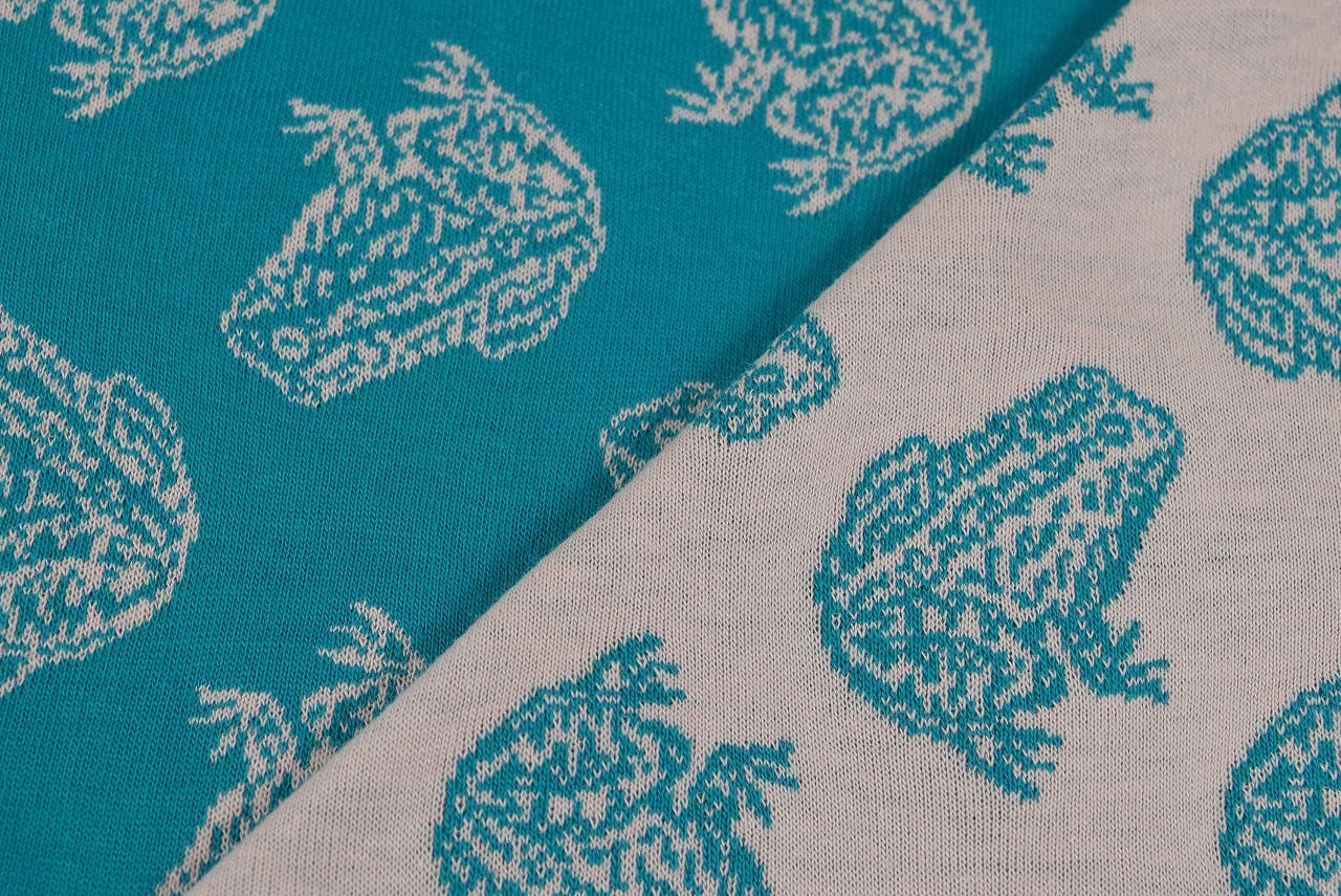 リバーシブルジャガードニット生地 かえる柄                 色:ピーコック/コーラルピンク