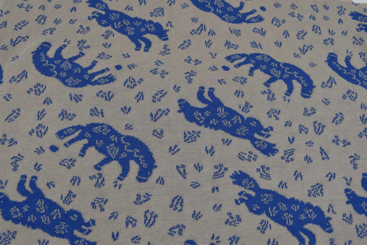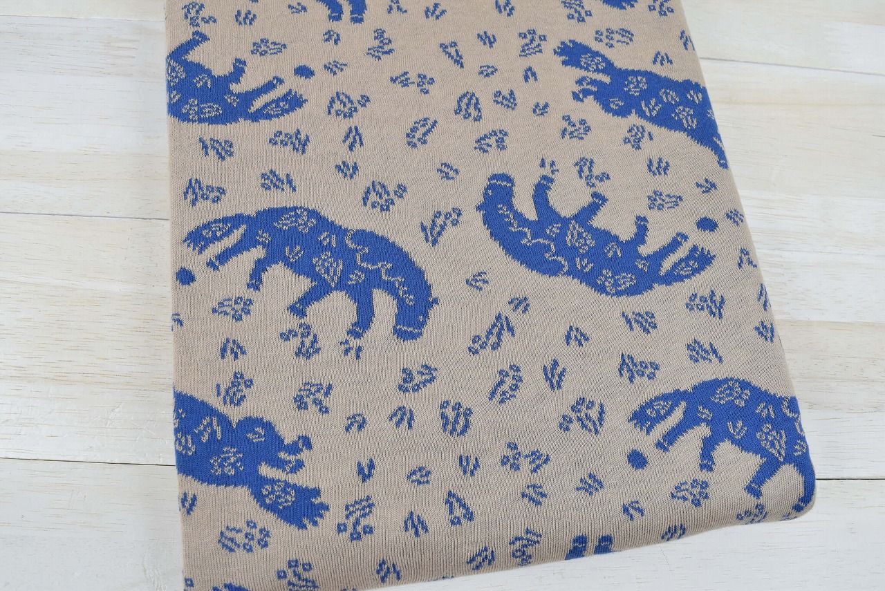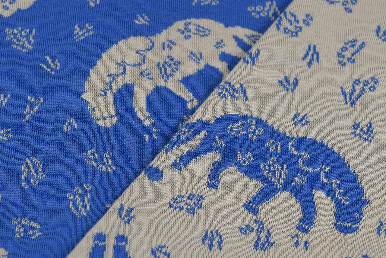 リバーシブルジャガードニット生地 耕す馬のひるやすみ柄           色:ジェイブルー/キャメル
