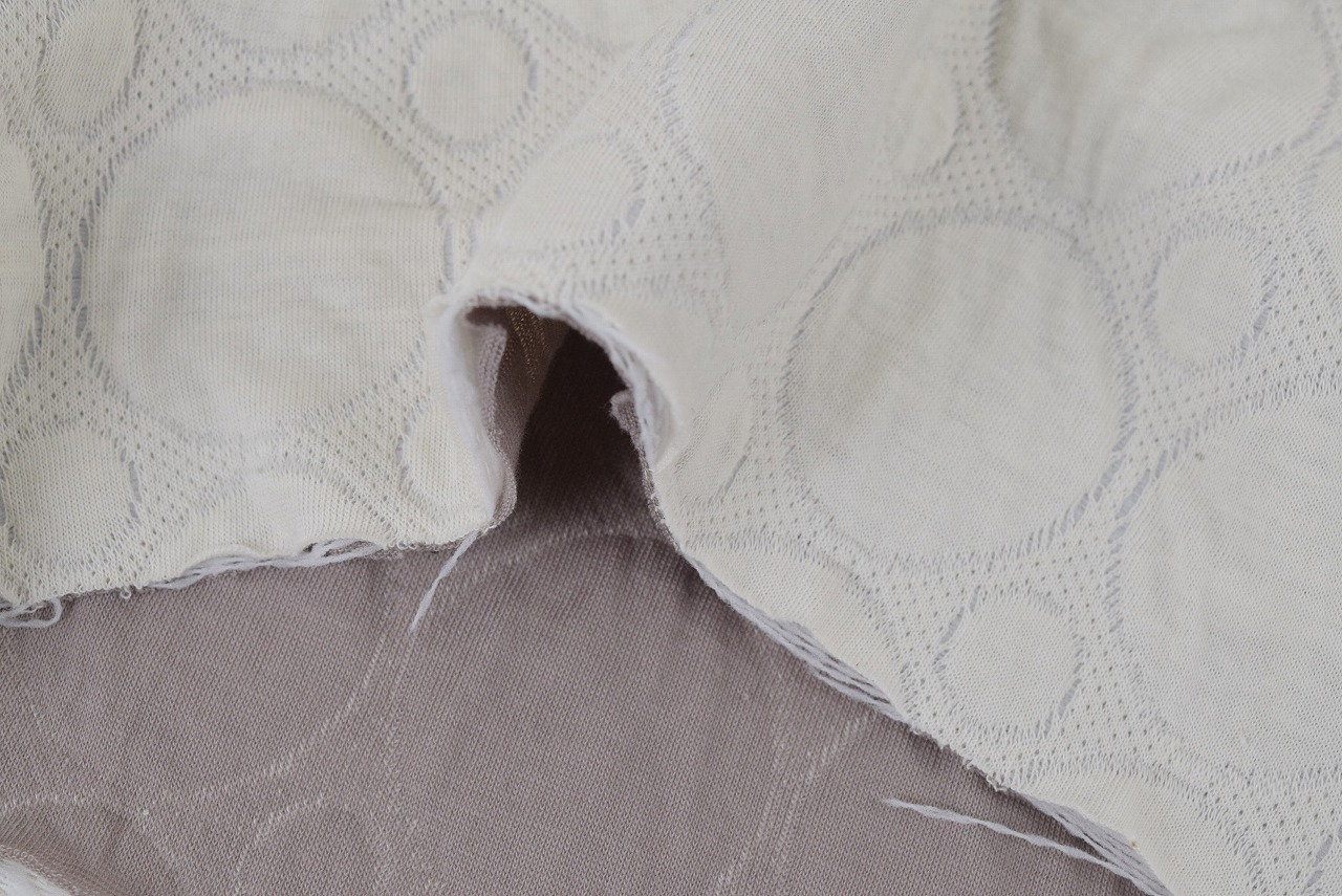 キルトニットの性質上、柄部分より中綿が見える場合がありますが、横方向に引っ張ることにより目立たなくなります。