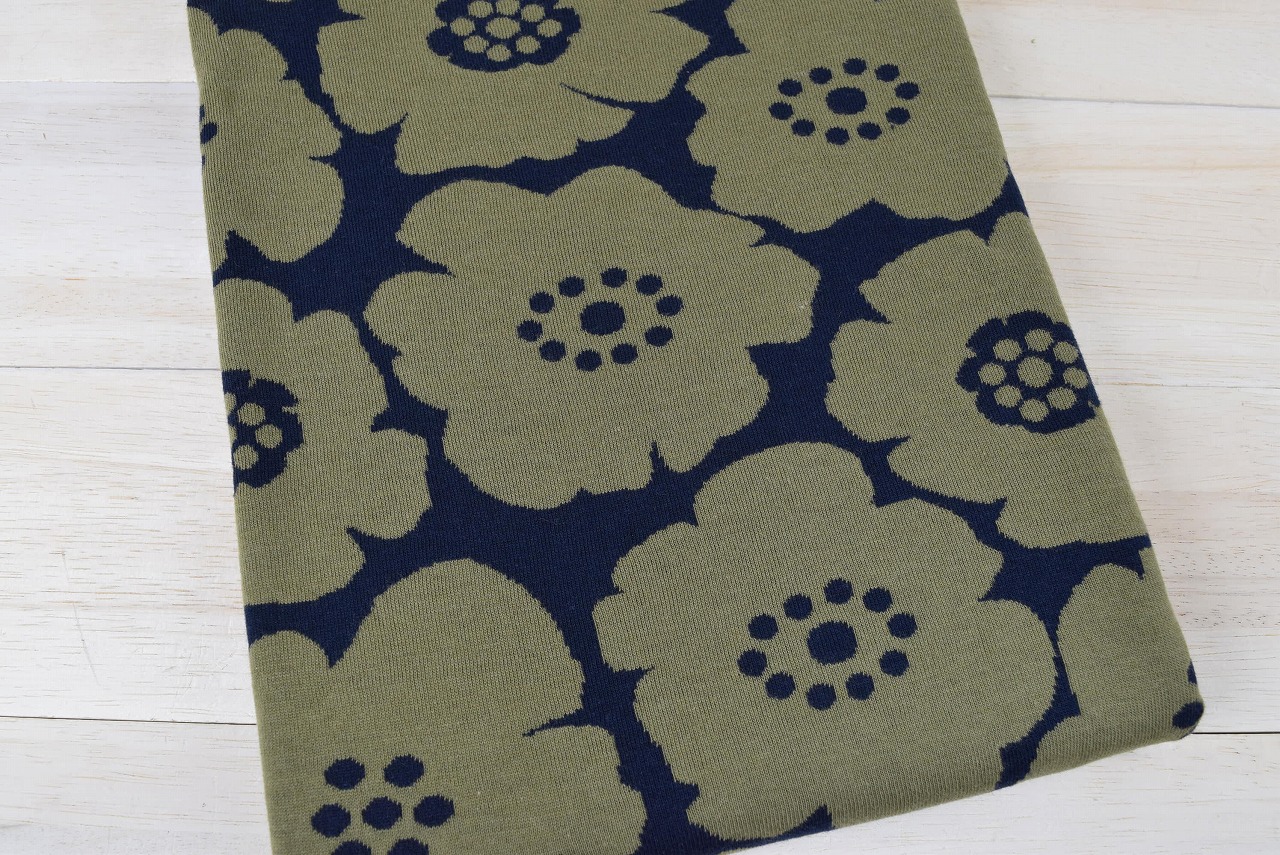 リバーシブルジャガードニット生地 アネモネ柄            色:ネイビー/モスグリーン