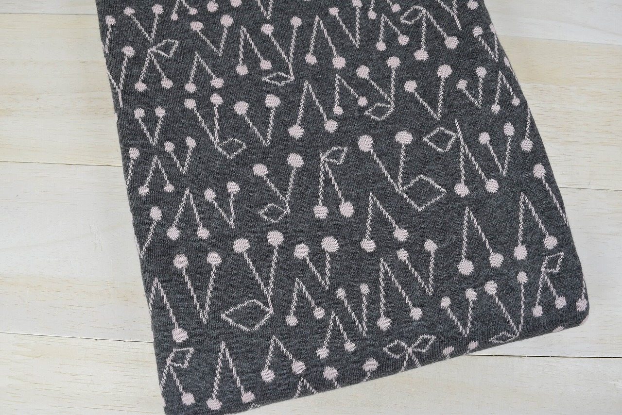 リバーシブルジャガードニット生地 さくらんぼ柄  (1m+品番マーク入り)       色:ダーク杢グレー/フレンチピンク