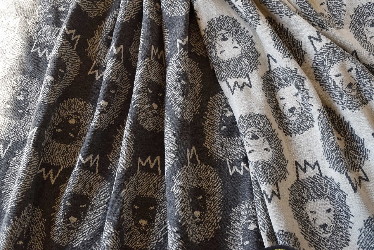 リバーシブルジャガードニット生地 ライオン柄(1.5mカット生地)         色:ダーク杢グレー/バニラ