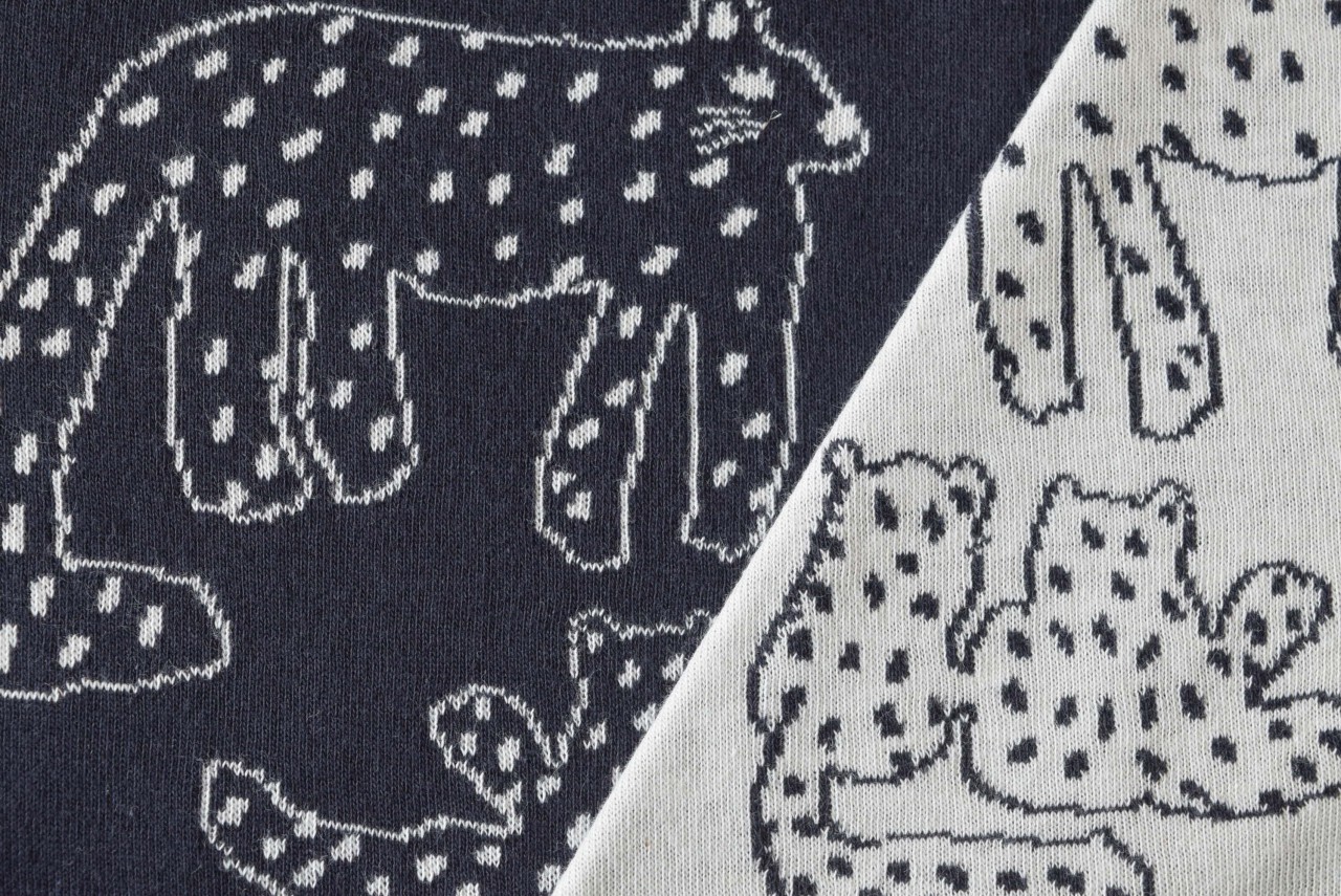 リバーシブルジャガードニット生地 ホワイトパンサー柄           色:ダークチャコール/アイボリー