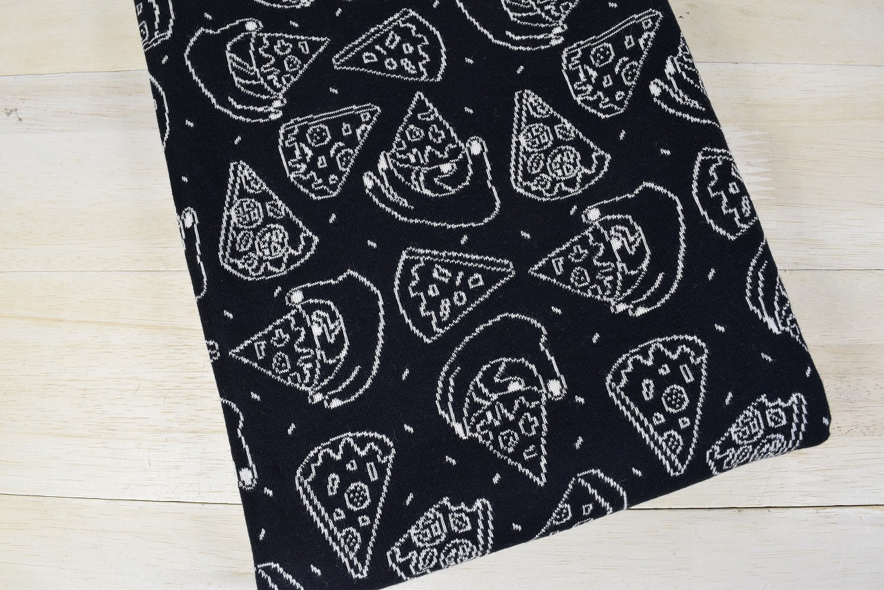 リバーシブルジャガードニット生地 ピザパーティー柄            色:黒/アイボリー