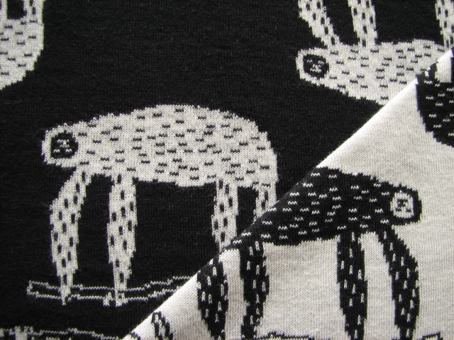 リバーシブルジャガードニット生地 なまけもの柄          色:黒/アイボリー
