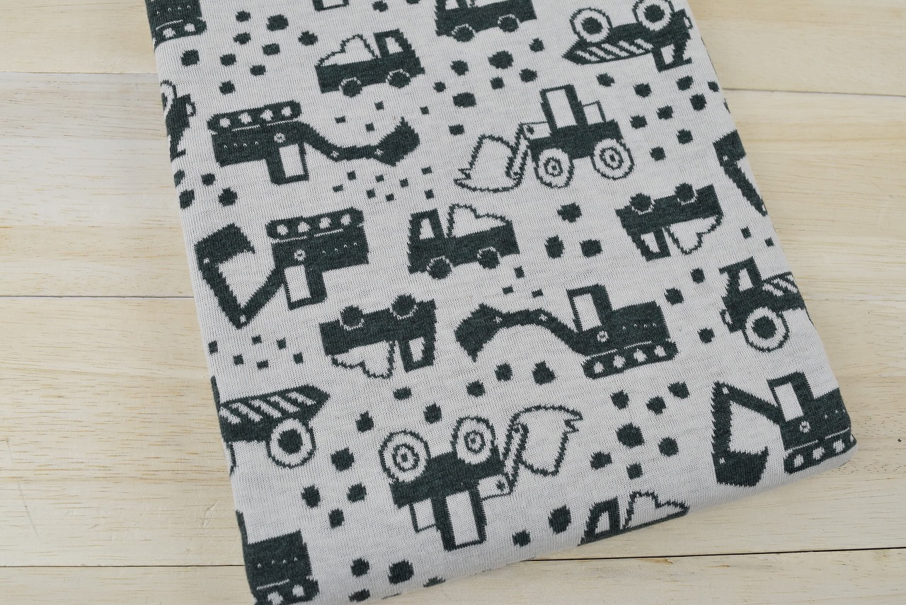 リバーシブルジャガードニット生地 ショベルカー柄               色:杢グリーン/アイボリー