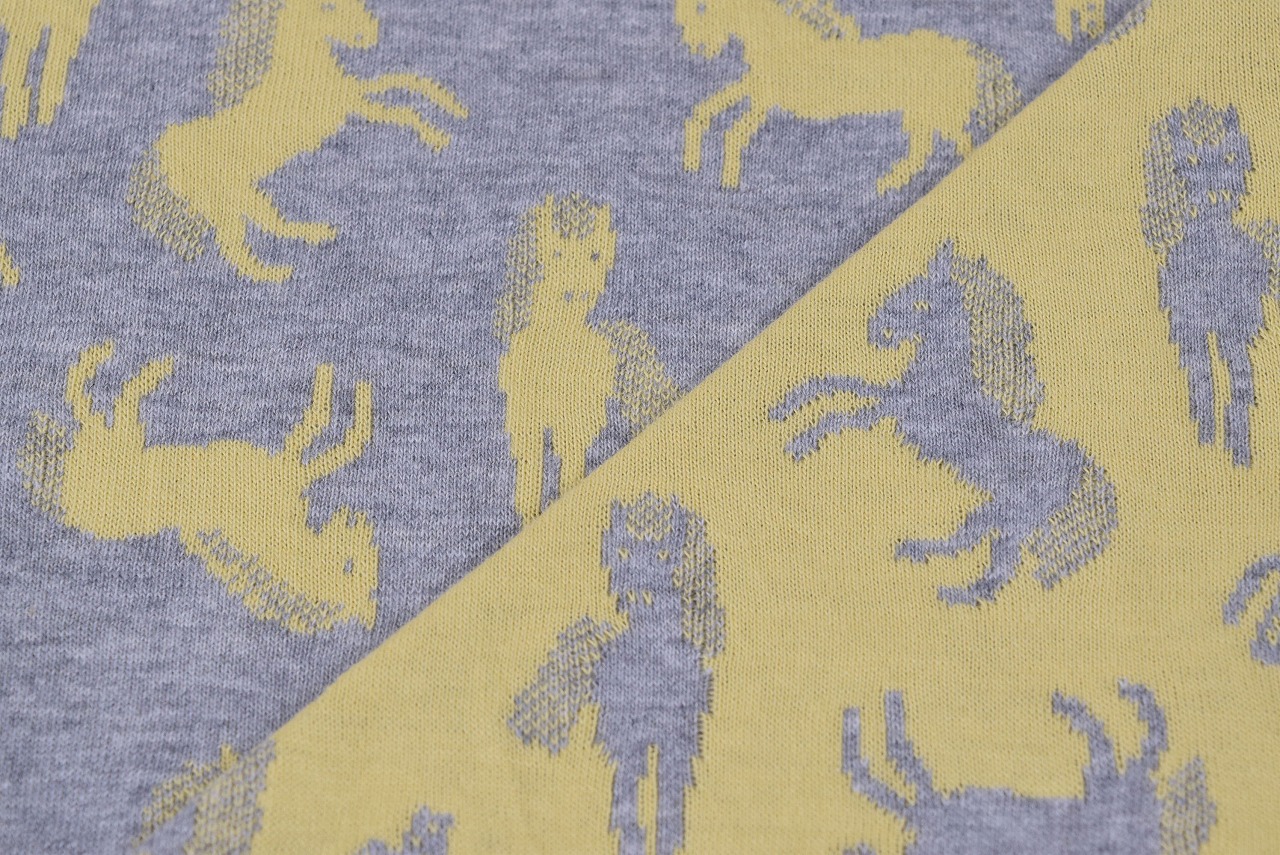 リバーシブルジャガードニット生地 ワイルドホース柄         色:杢グレー/イチョウ