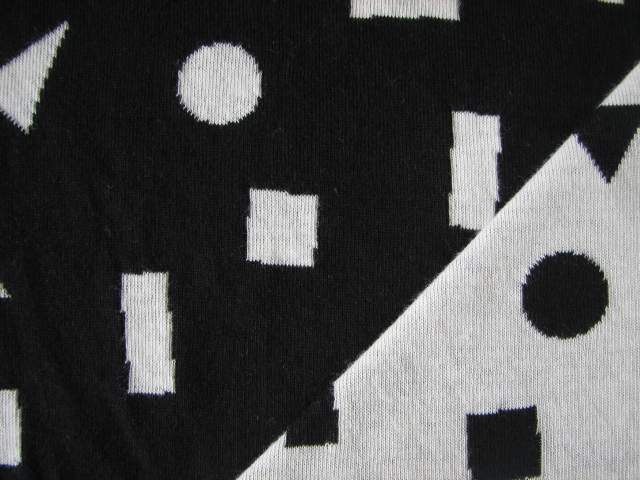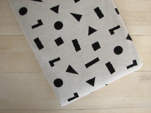 丸三角四角の単純な積み木柄ですがモノトーンでまとめることでどことなく大人っぽく落ち着いた柄に仕上がりました。