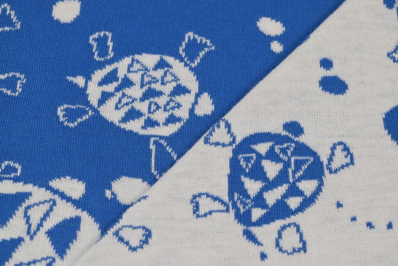 リバーシブルジャガードニット生地 のんびりひと泳ぎ柄           色:ミディアムブルー/アイボリー