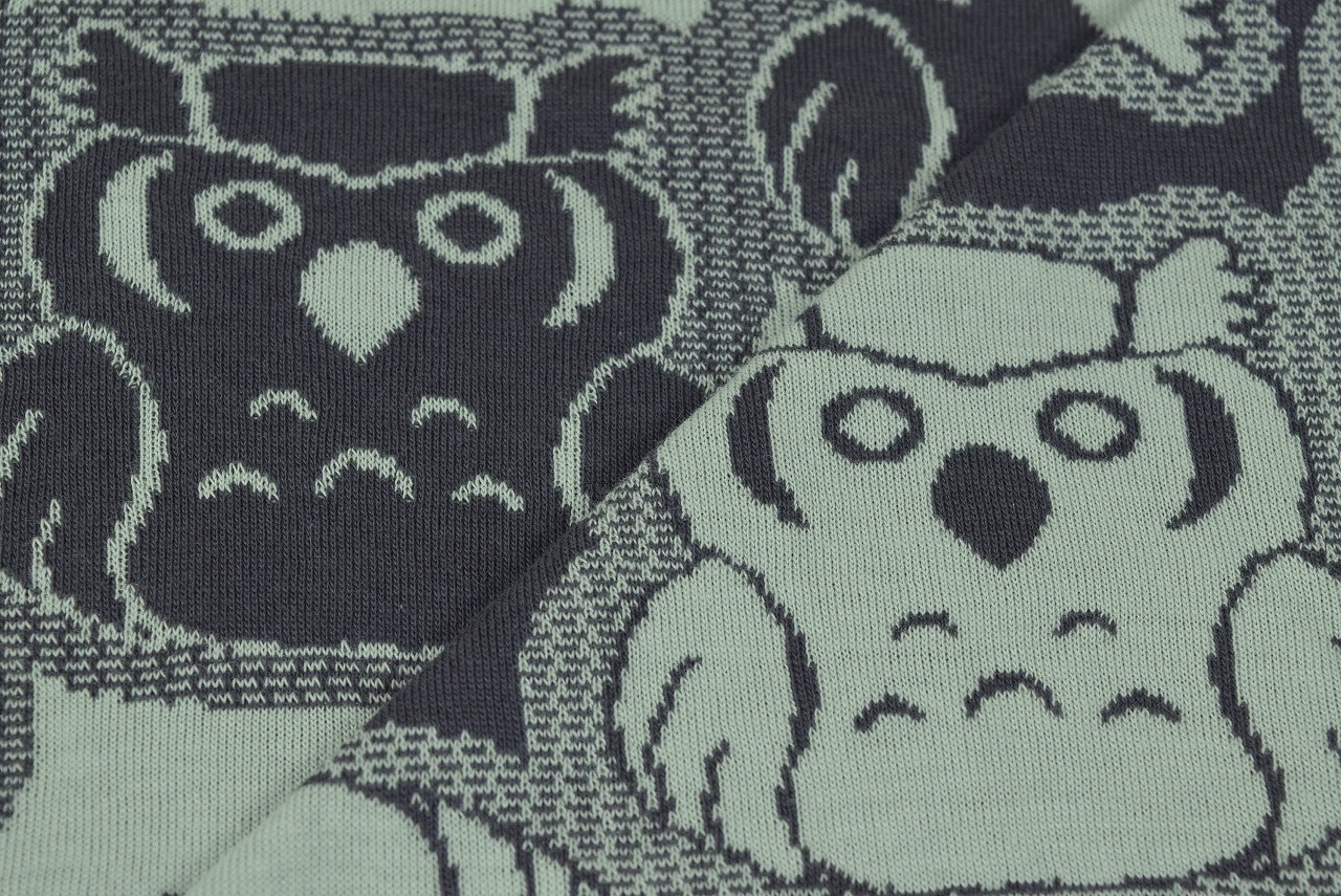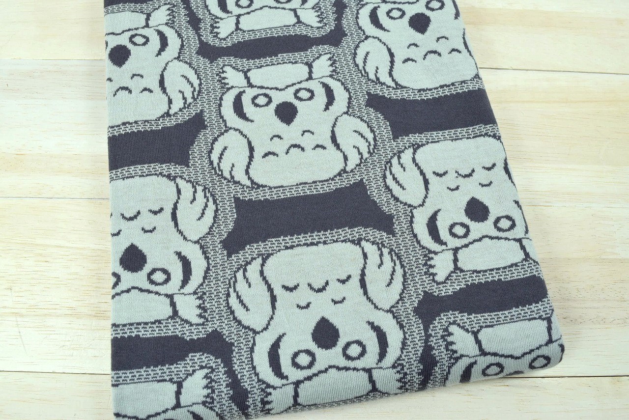 リバーシブルジャガードニット生地 みみずく柄           色:チャコールグレー/オフミント