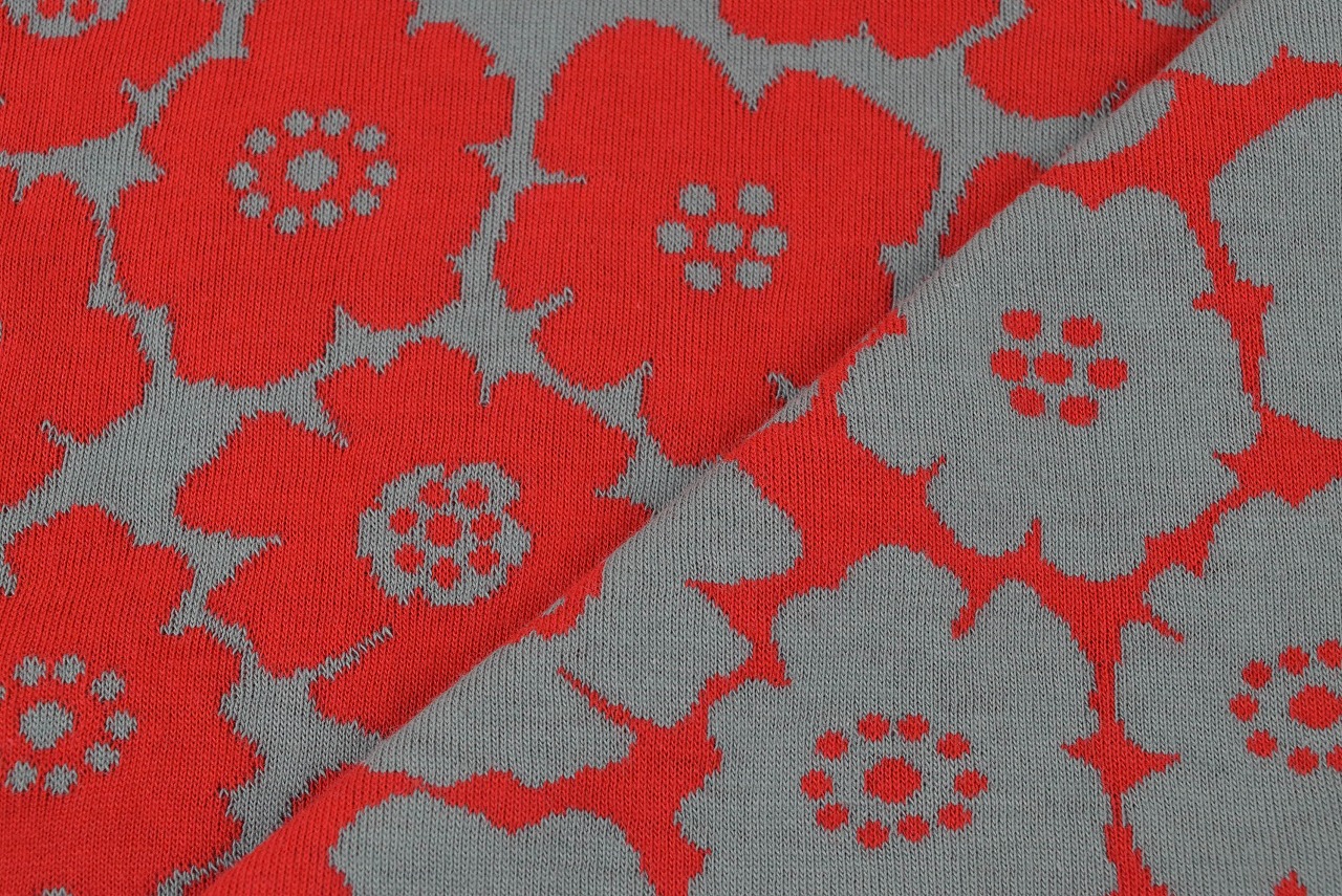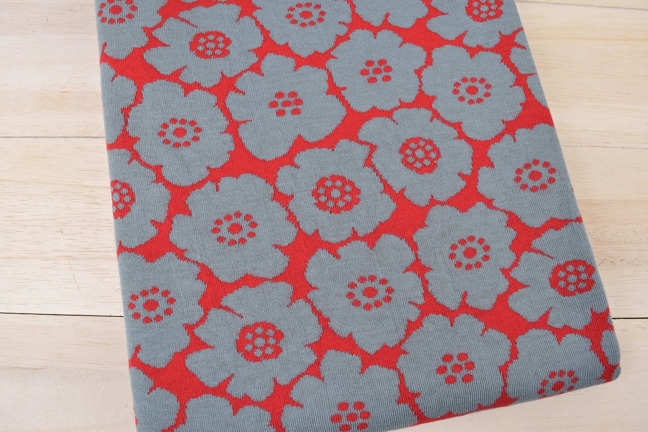 リバーシブルジャガードニット生地 ミニアネモネ柄         色:レッド/アロエ