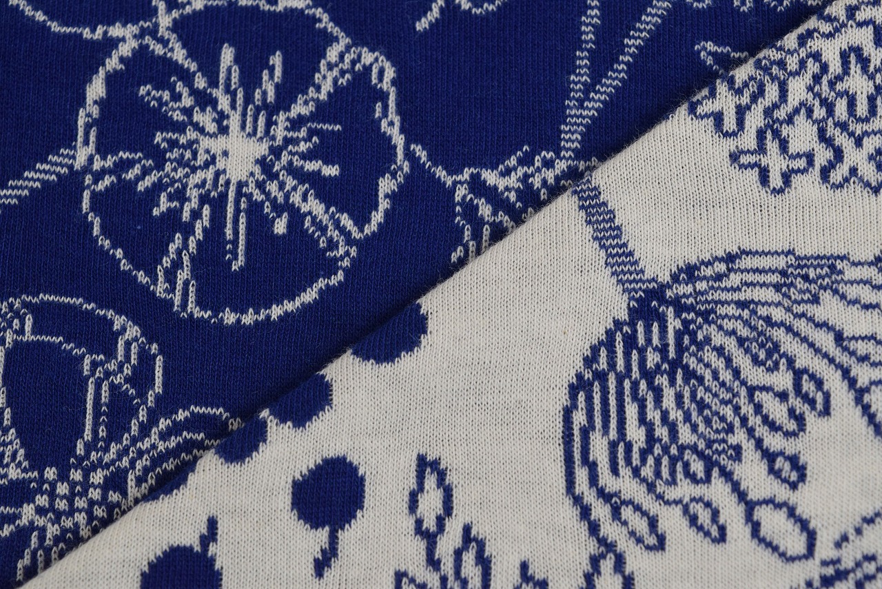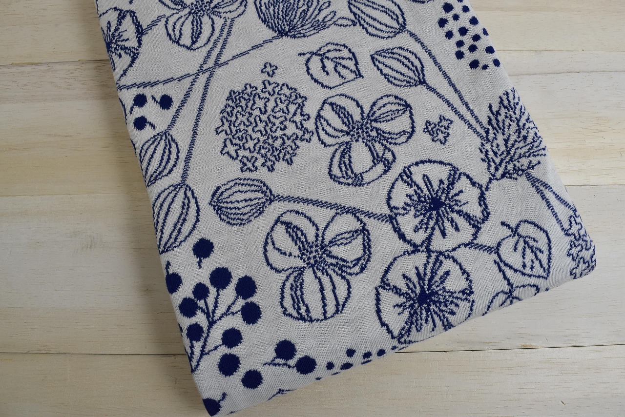 リバーシブルジャガードニット生地 フロリスト柄         色:サファイヤ/アイボリー