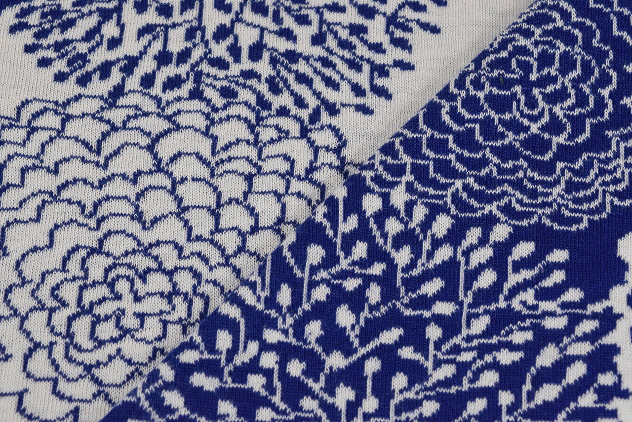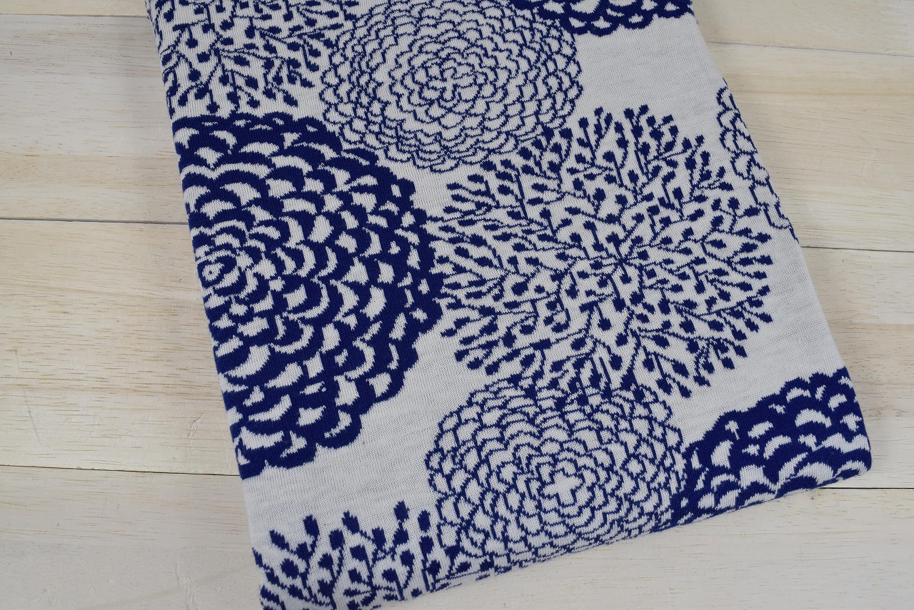 リバーシブルジャガードニット生地 ダリア柄               色:サファイア/アイボリー
