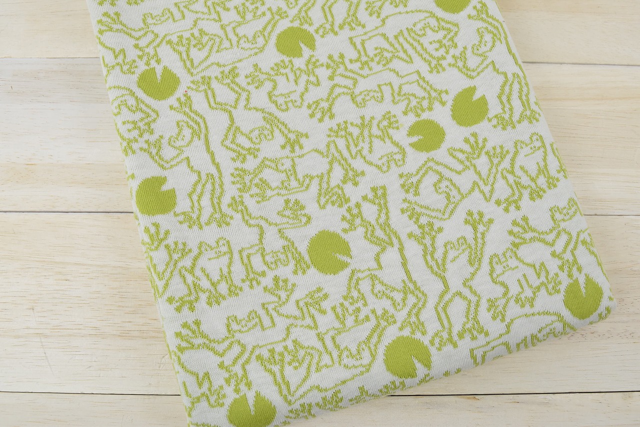 リバーシブルジャガードニット生地 フロッグス柄                  色:青りんご/アイボリー