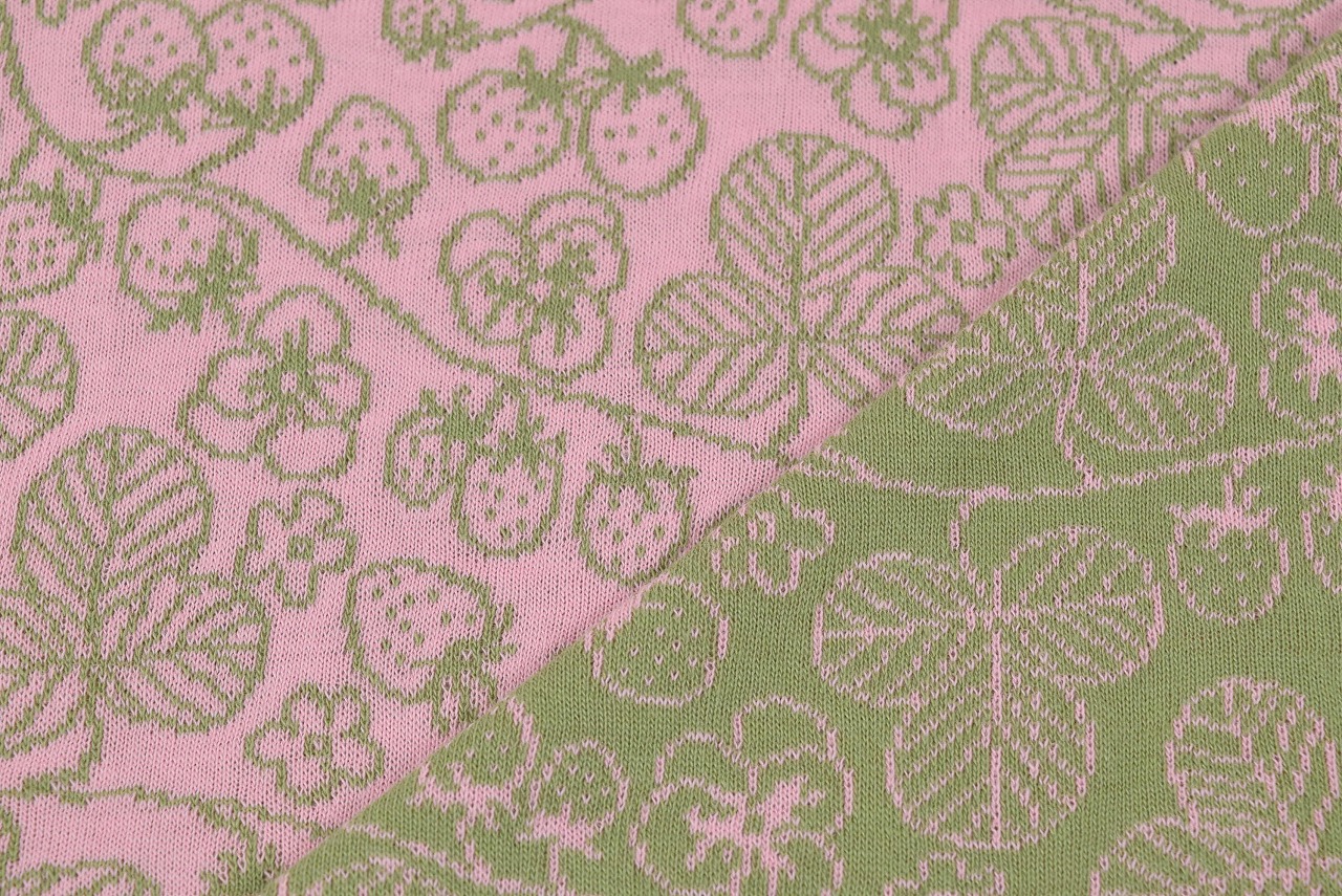 リバーシブルジャガードニット生地 ワイルドストロベリー柄             色:グラスグリーン/フレッシュピンク