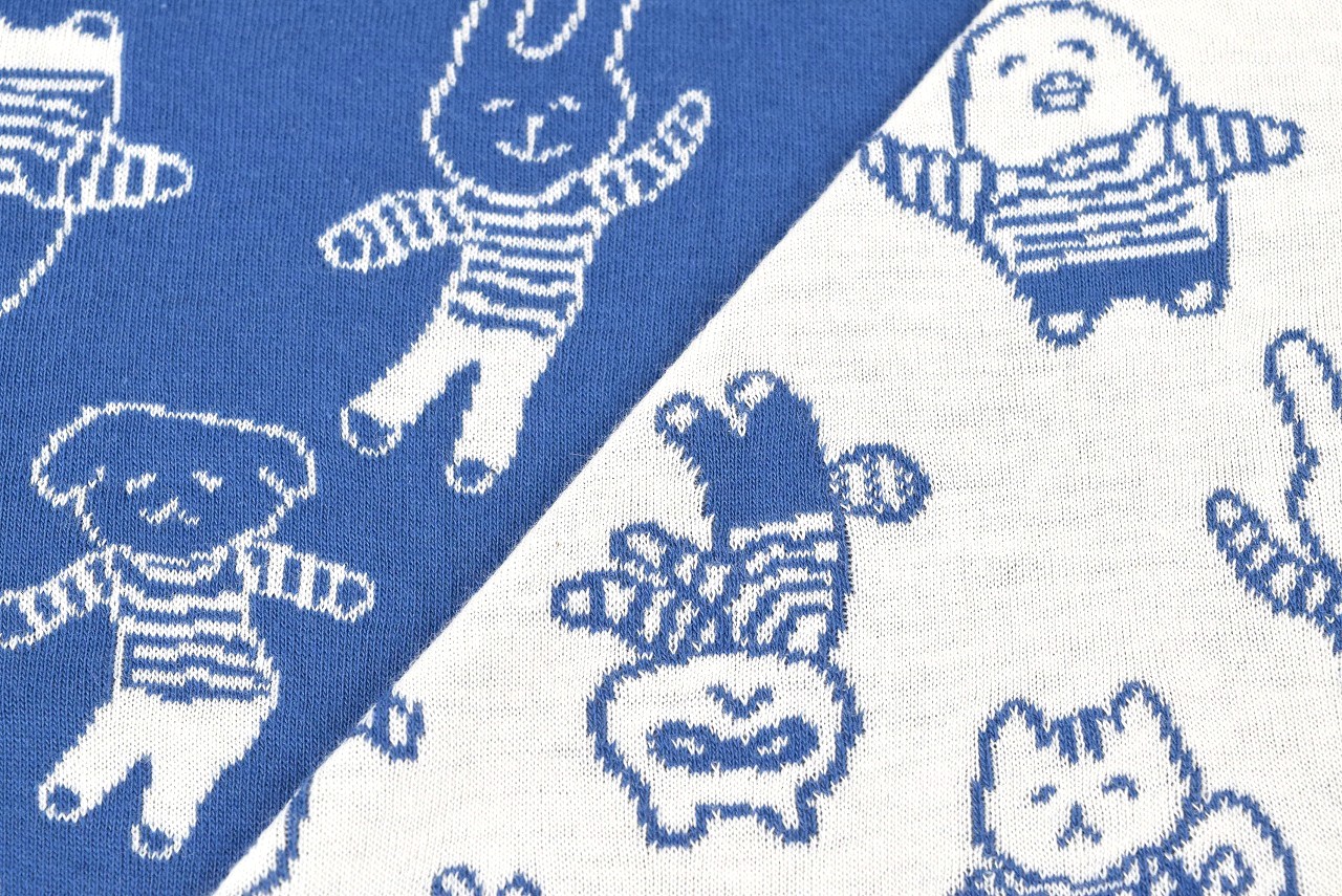 リバーシブルジャガードニット生地 〈くしゃかわ×maffon〉ボーダーびより柄         色:ジェイブルー/アイボリー