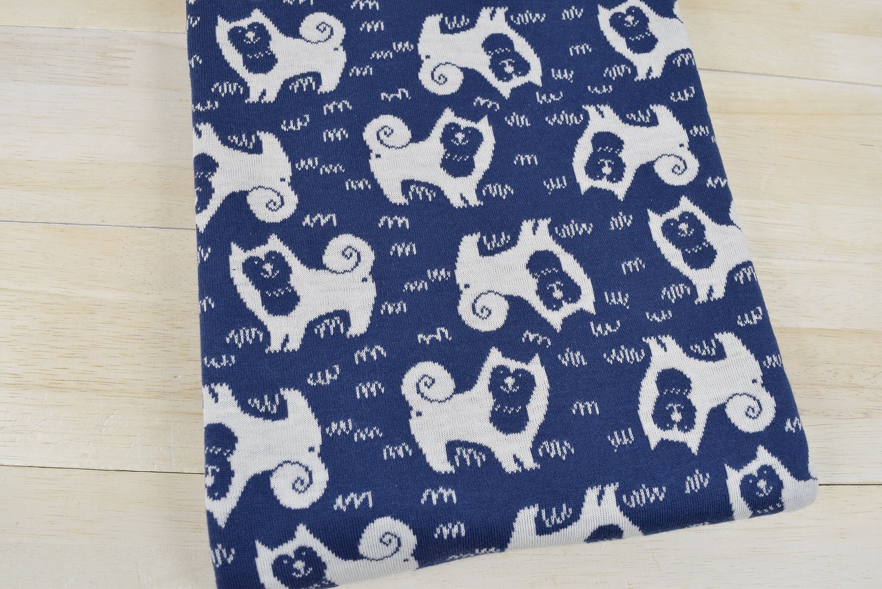 リバーシブルジャガードニット生地 おさんぽびより柄 色:ジェイブルー/アイボリー