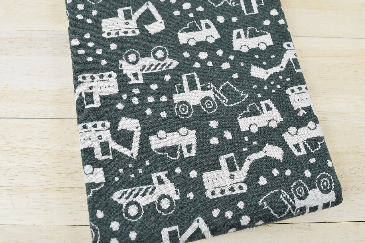 リバーシブルジャガードニット生地 ショベルカー柄 色:杢グリーン/アイボリー