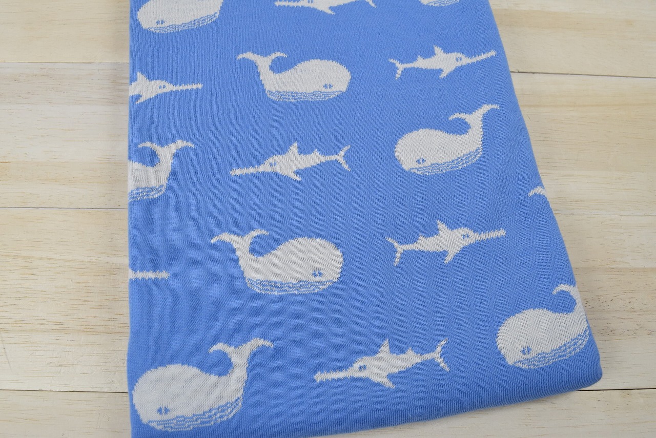 リバーシブルジャガードニット生地 くじら柄 色:スカイブルー/アイボリー