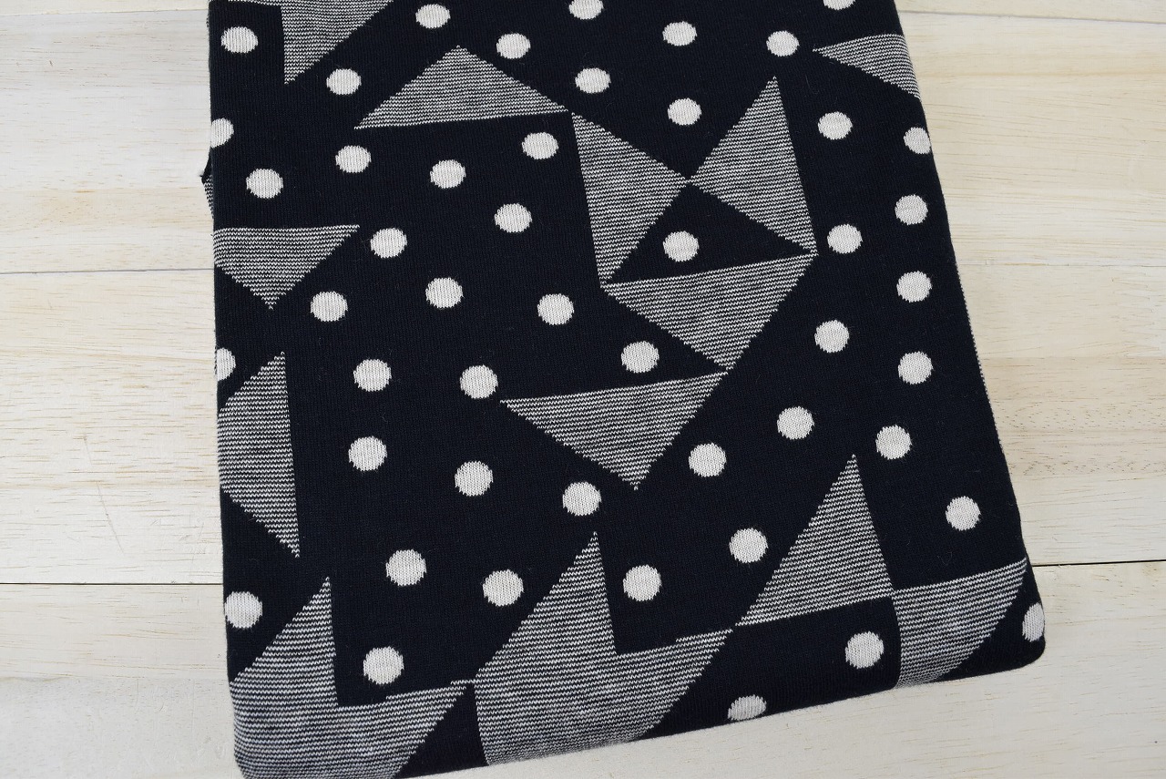リバーシブルジャガードニット生地 ドット&ボーダー柄 色:黒/アイボリー