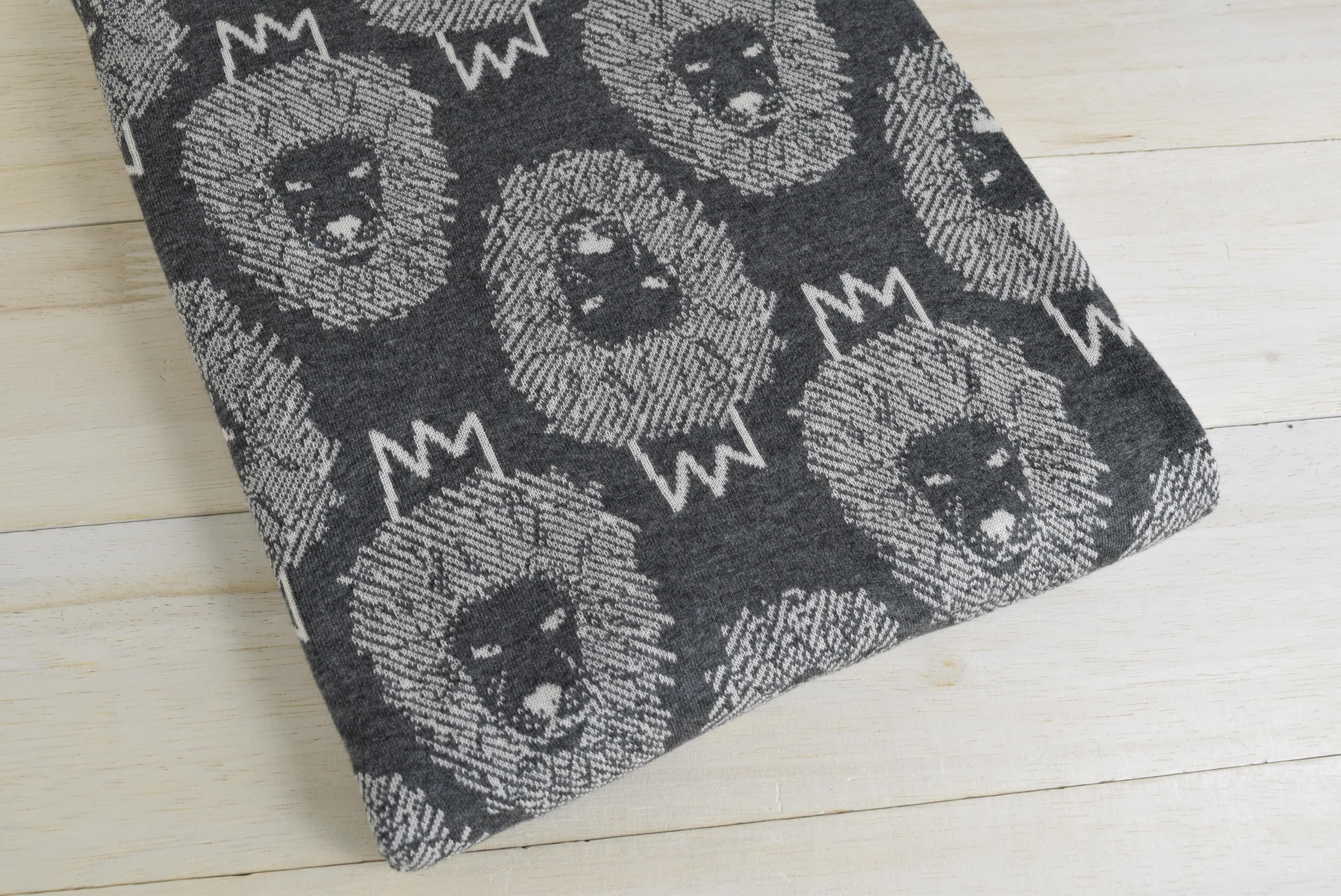 リバーシブルジャガードニット生地 ライオン柄(1.5mカット生地) 色:ダーク杢グレー/バニラ
