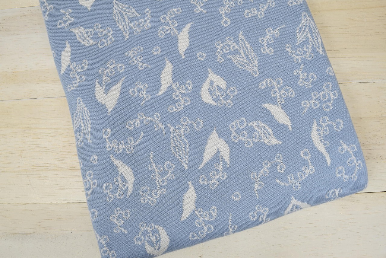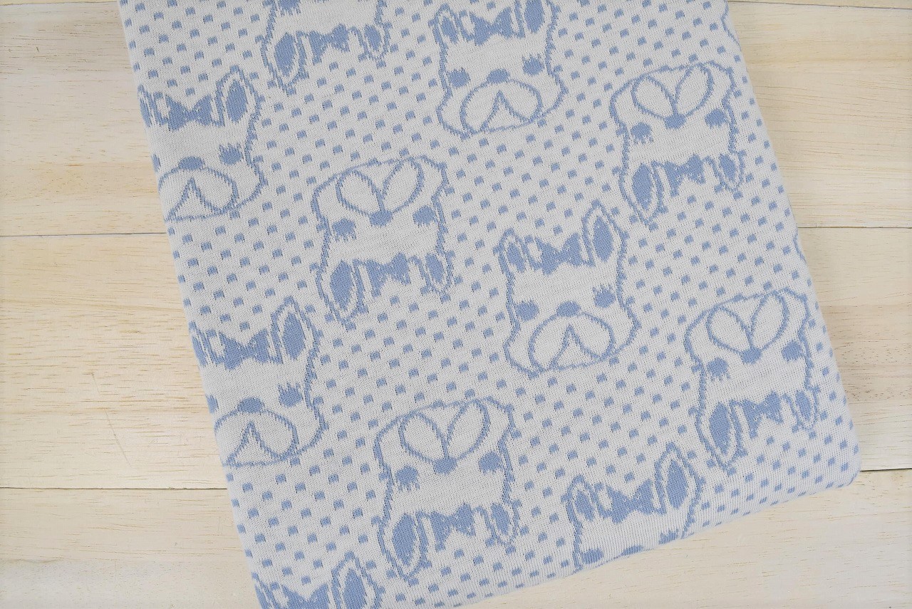 リバーシブルジャガードニット生地 ふわもこプードル柄 色:カデットブルー/アイボリー