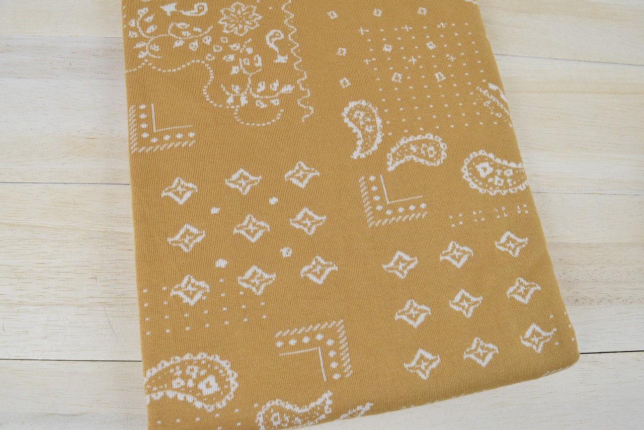 リバーシブルジャガードニット生地 バンダナ柄 色:マスタード/アイボリー