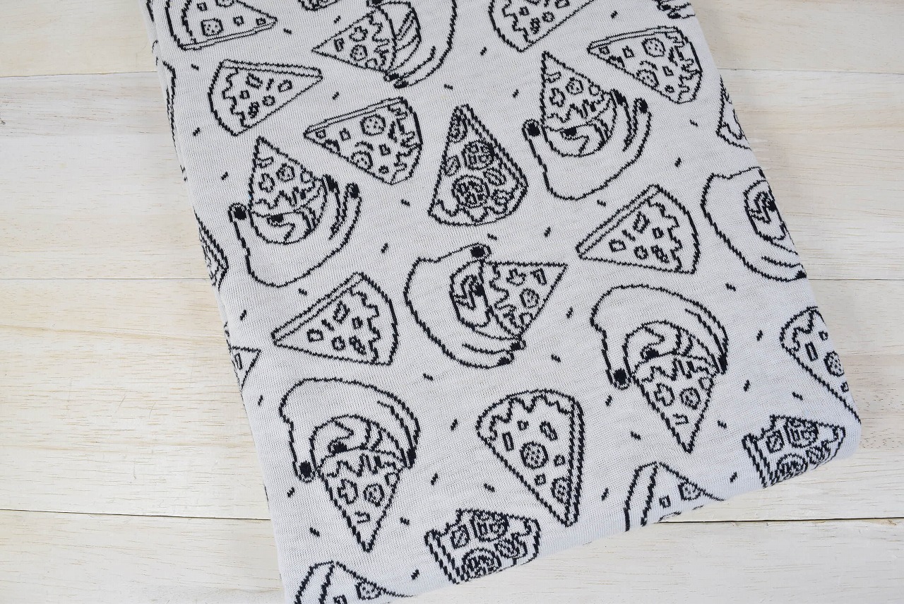 リバーシブルジャガードニット生地 ピザパーティー柄 色:黒/アイボリー
