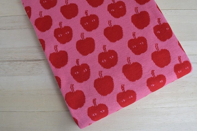リバーシブルジャガードニット生地 アップルアタック柄 色:レッド/STピンク
