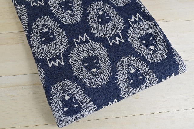 リバーシブルジャガードニット生地 ライオン柄 色:杢ネイビー/アイボリー