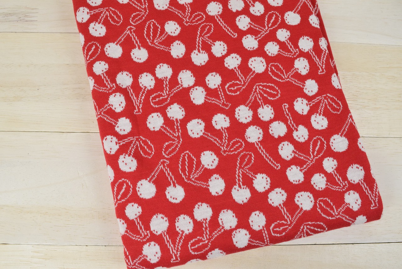 リバーシブルジャガードニット生地 チェリーズ柄 色:レッド/アイボリー