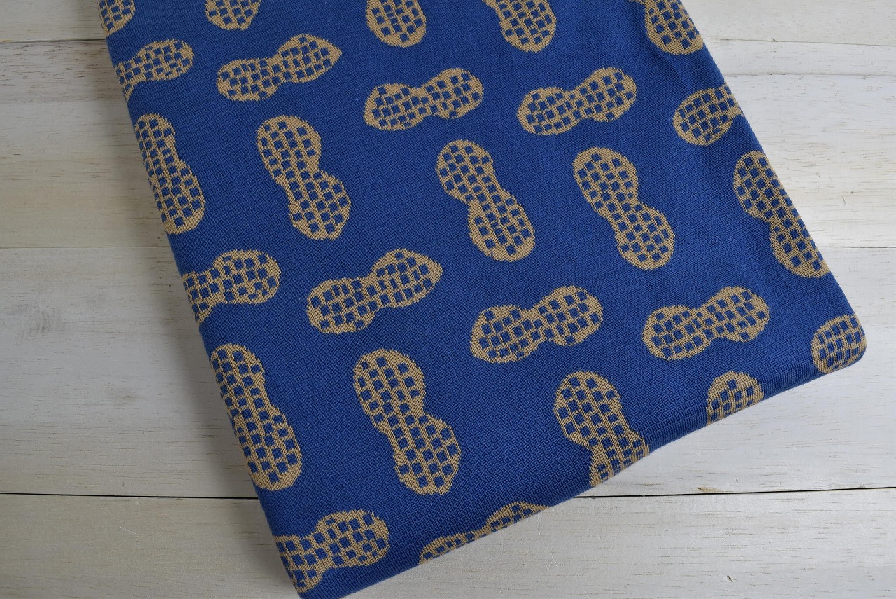 リバーシブルジャガードニット生地 ピーナッツ柄 色:ジェイブルー/キャメル
