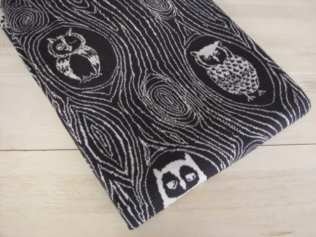 リバーシブルジャガードニット生地 ふくろう柄 色:ダークチャコール/アイボリー