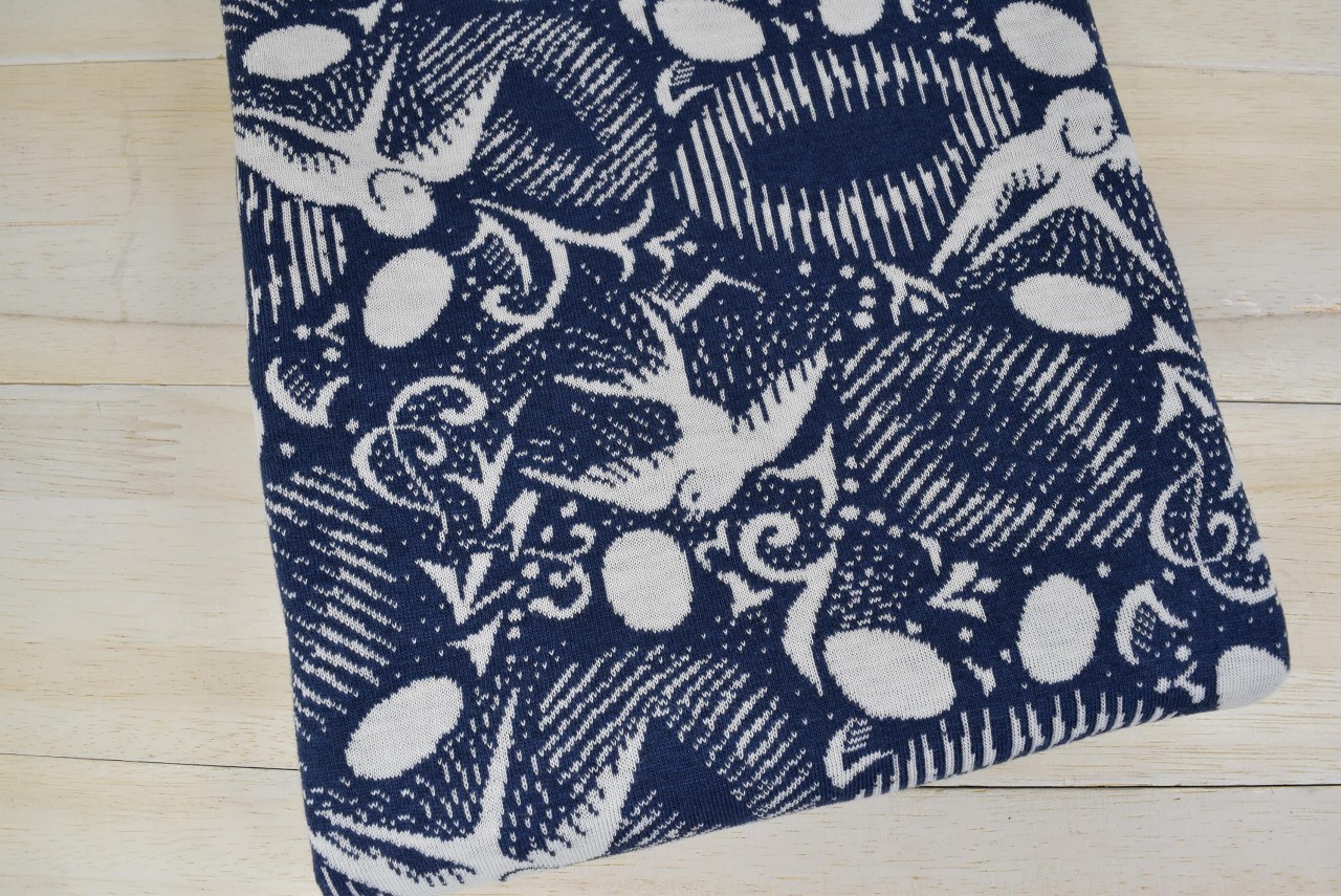 リバーシブルジャガードニット生地 スワロウ柄 色:ダルブルー/アイボリー
