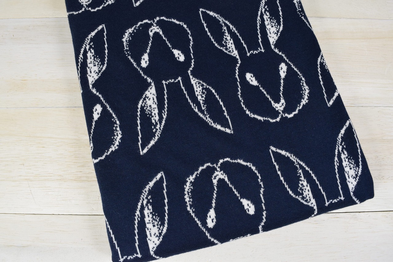 リバーシブルジャガードニット生地 おすましうさぎ柄 色:ネイビー/アイボリー