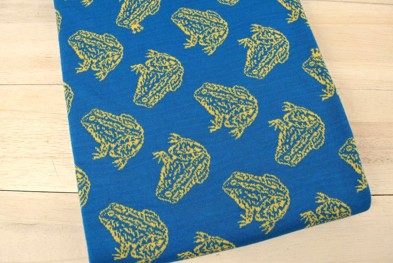 リバーシブルジャガードニット生地 かえる柄 色:ブルーラグーン/イエロー