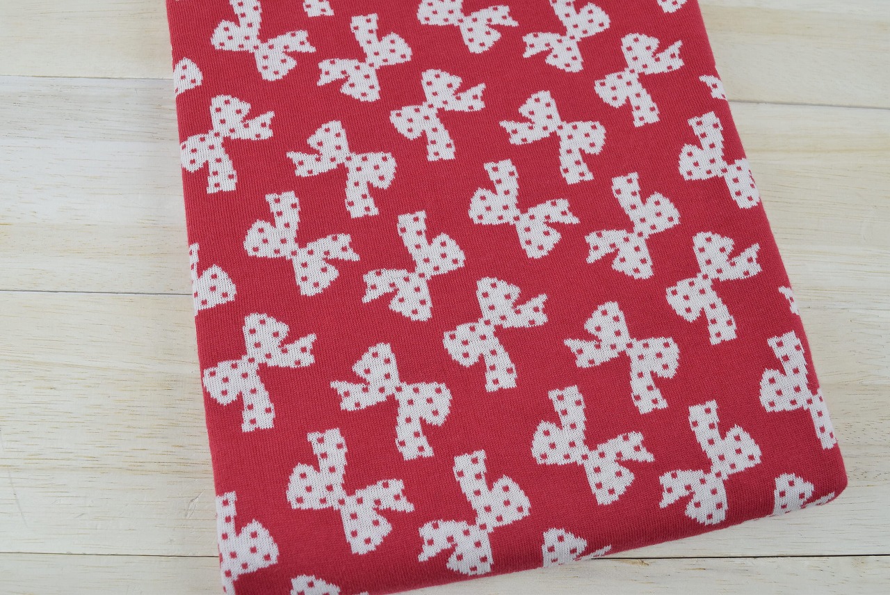 リバーシブルジャガードニット生地 ドットリボン柄 色:カーマイン/アイボリー