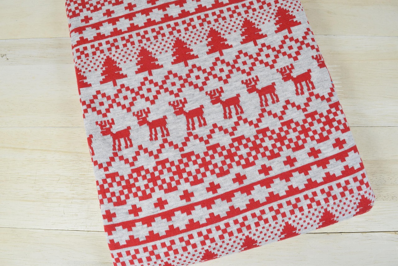 リバーシブルジャガードニット生地 ウインターホリデー柄 色:アッシュ杢/レッド