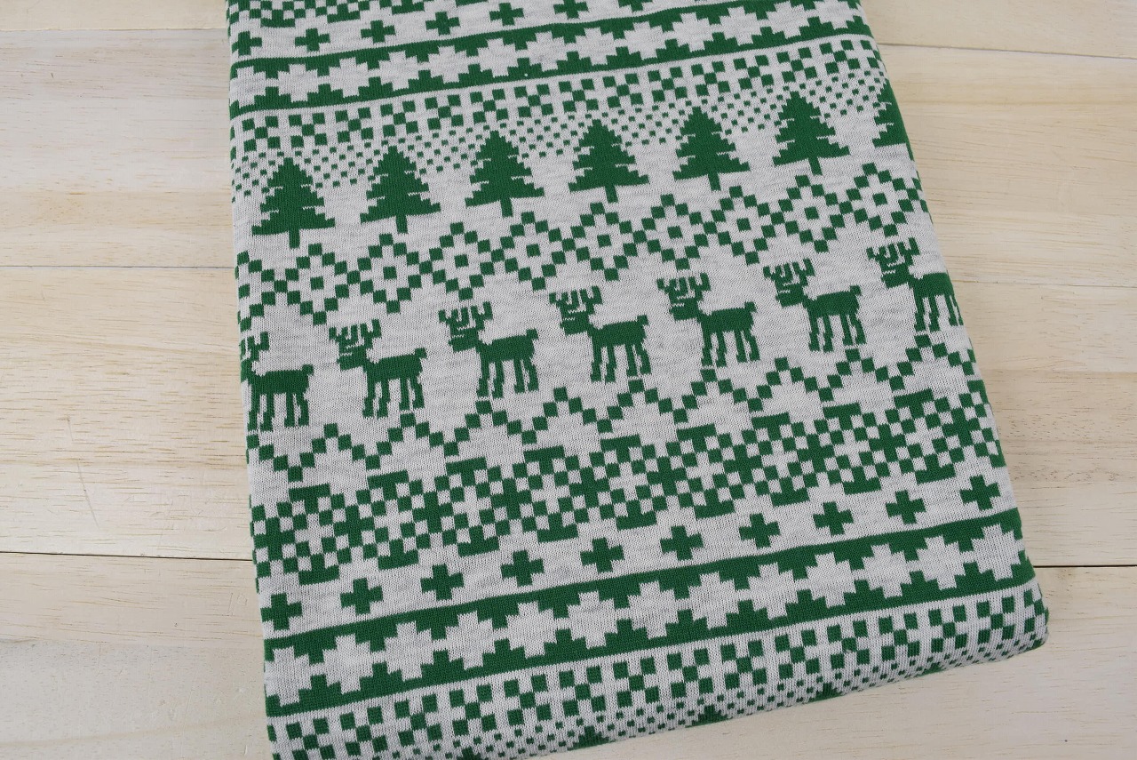 リバーシブルジャガードニット生地 ウインターホリデー柄 色:アッシュ杢/ビリジアン