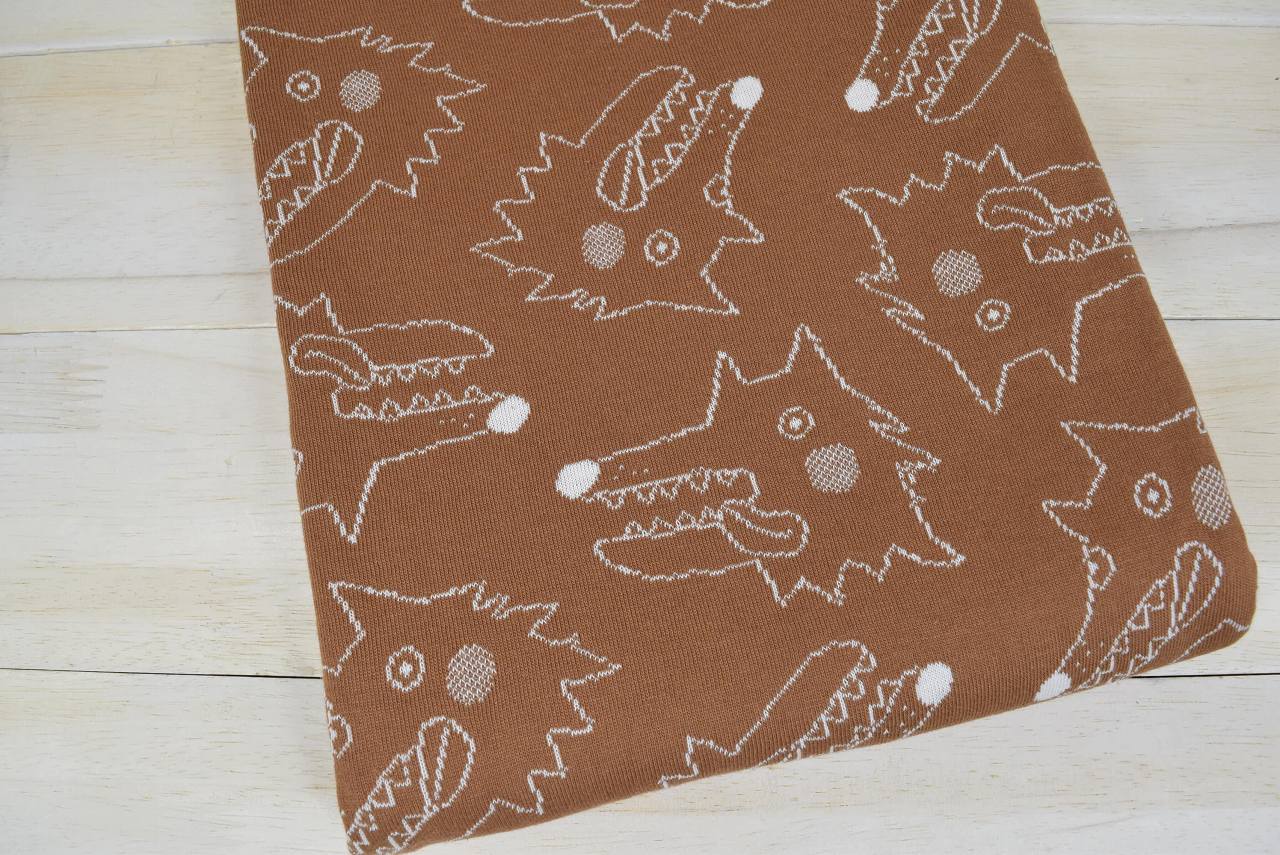 リバーシブルジャガードニット生地 おおかみ柄 色:メイプル/アイボリー