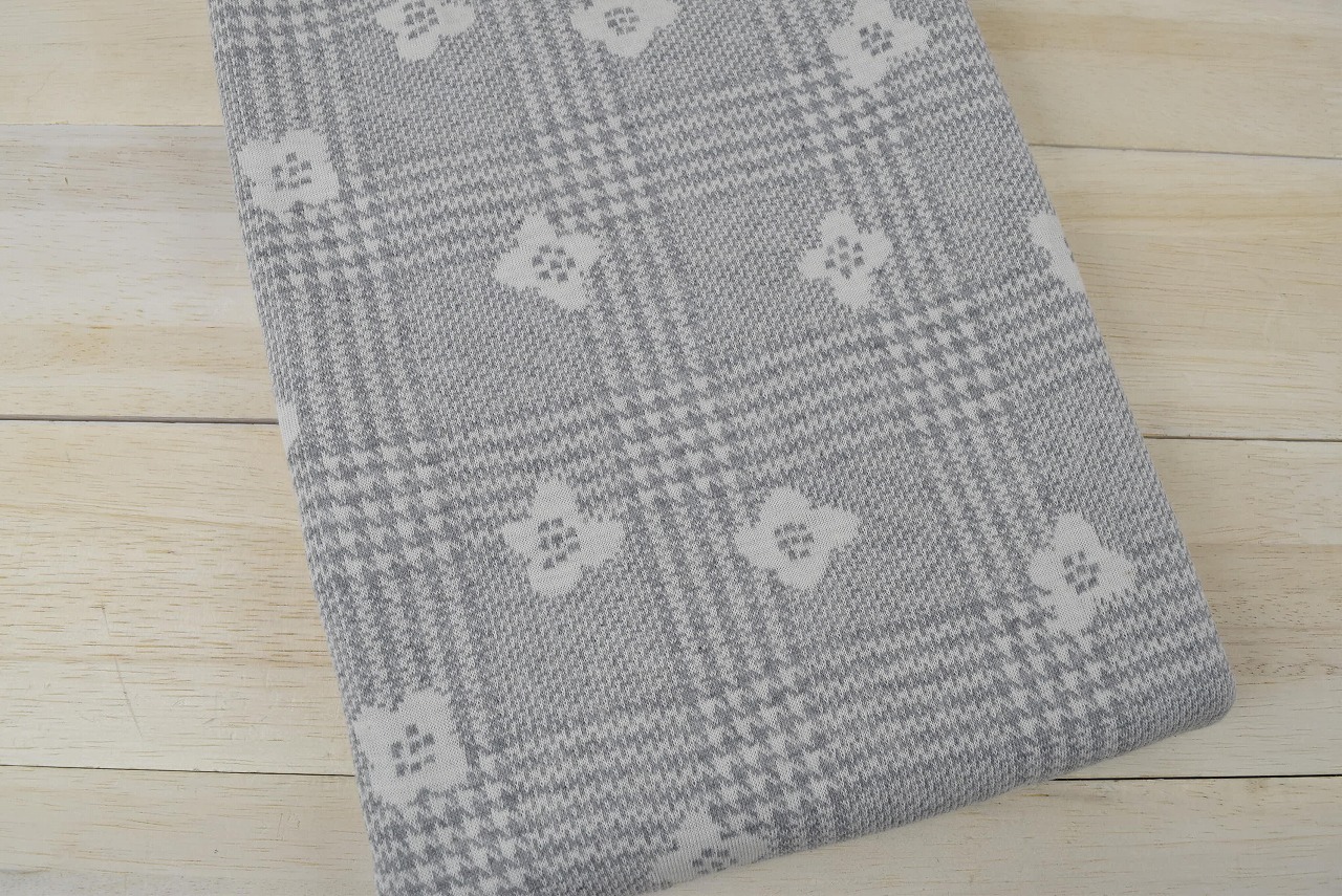 リバーシブルジャガードニット生地 グレンチェックフラワー柄 色:杢グレー/アイボリー