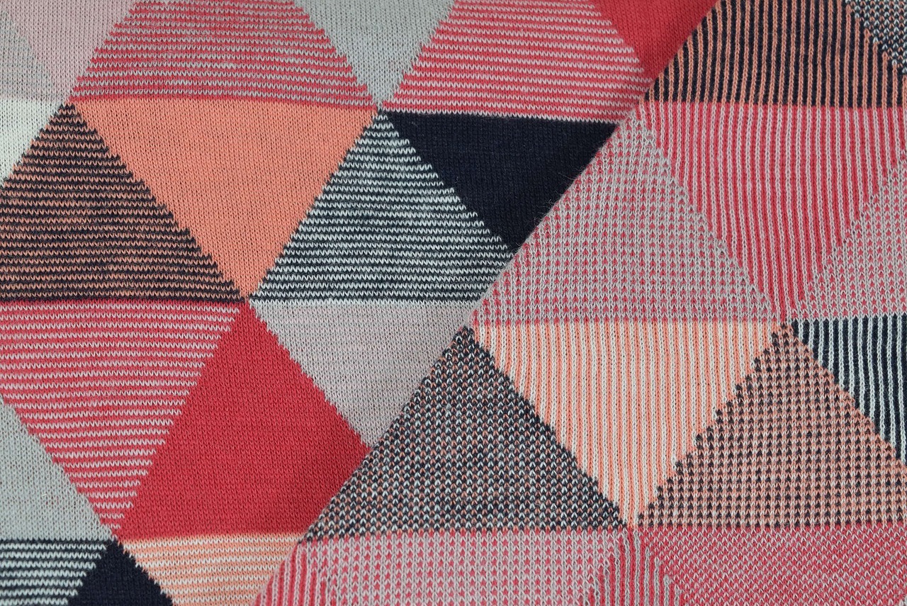 リバーシブルジャガードニット生地 トライアングルブロック柄         色:C#16:カーマイン/ネイビー/アッシュ/フラミンゴ/ダスティピンク/アイボリー