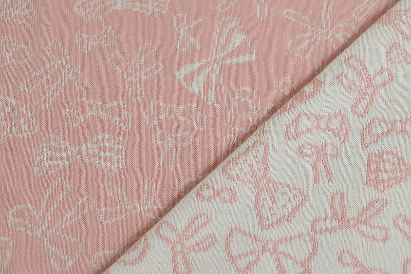 リバーシブルジャガードニット生地 リボンリボン柄         色:コーラルピンク/アイボリー