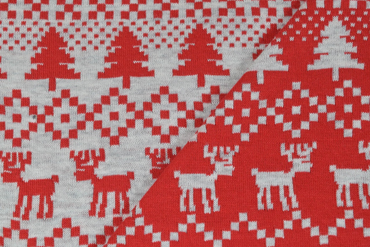 リバーシブルジャガードニット生地 ウインターホリデー柄                色:アッシュ杢/レッド