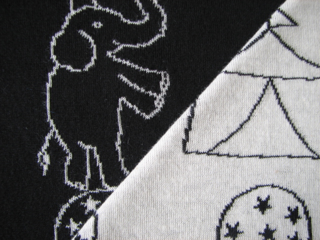 リバーシブルジャガードニット生地 サーカスエレファント柄     色:黒/アイボリー